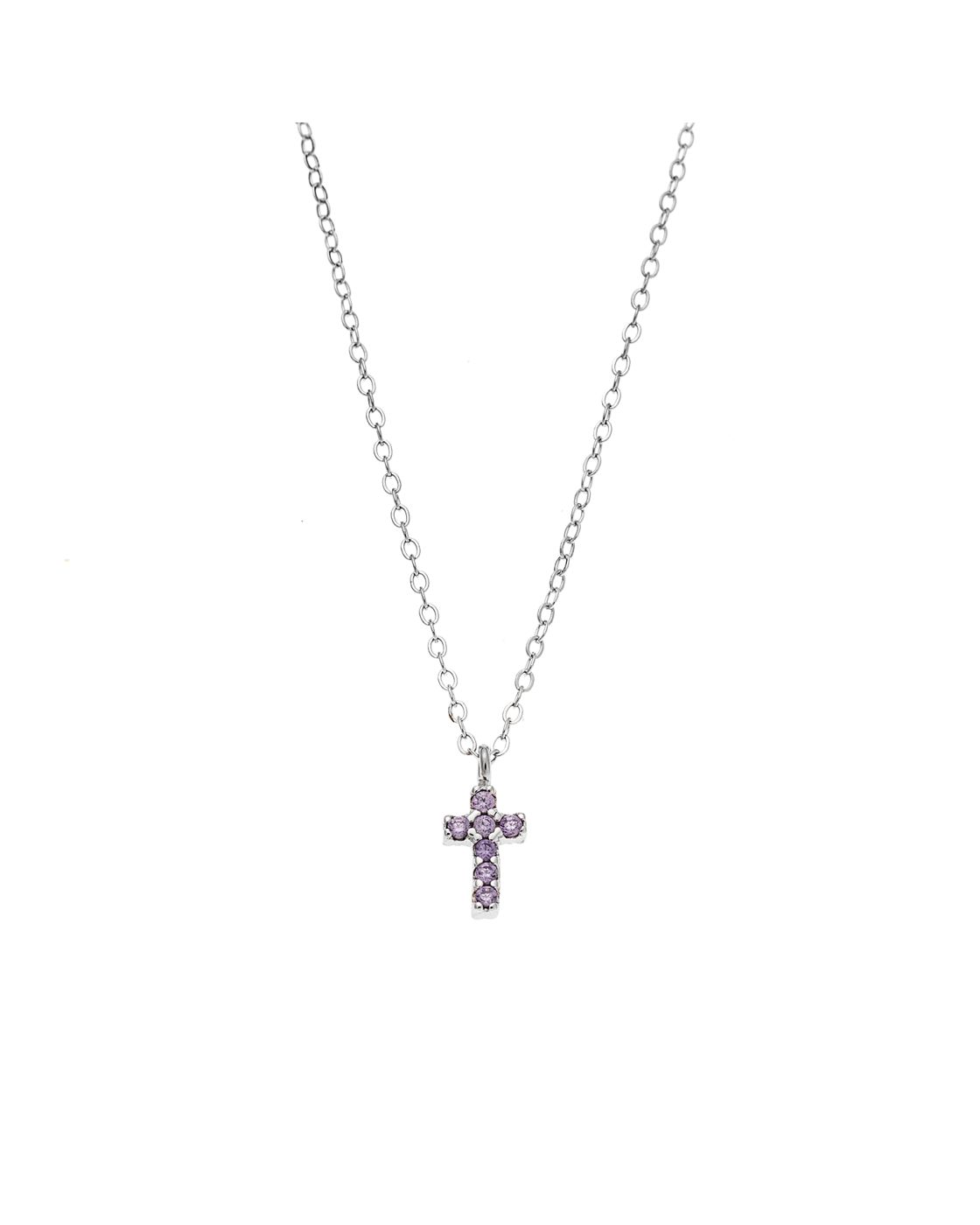 Κολιέ Selena ασήμι 925, σταυρουδάκι διπλής όψης με μωβ και λευκά ζιργκόν