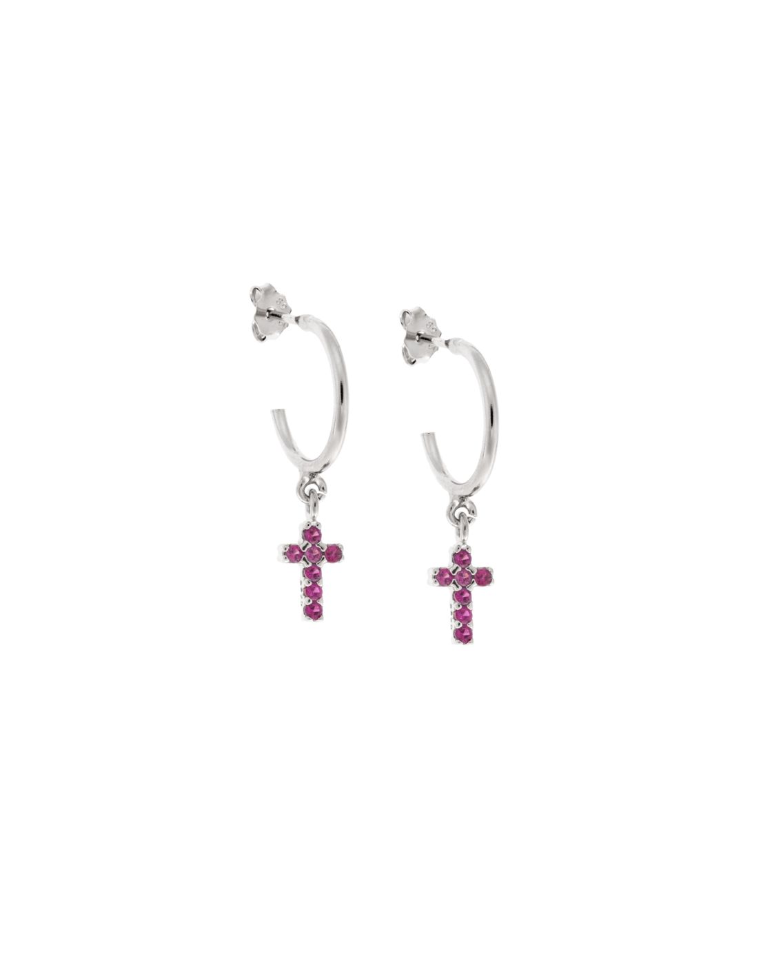 Σκουλαρίκια Κρίκοι Selena ασήμι 925, σταυρουδάκι διπλής όψης με φούξια και λευκά ζιργκόν